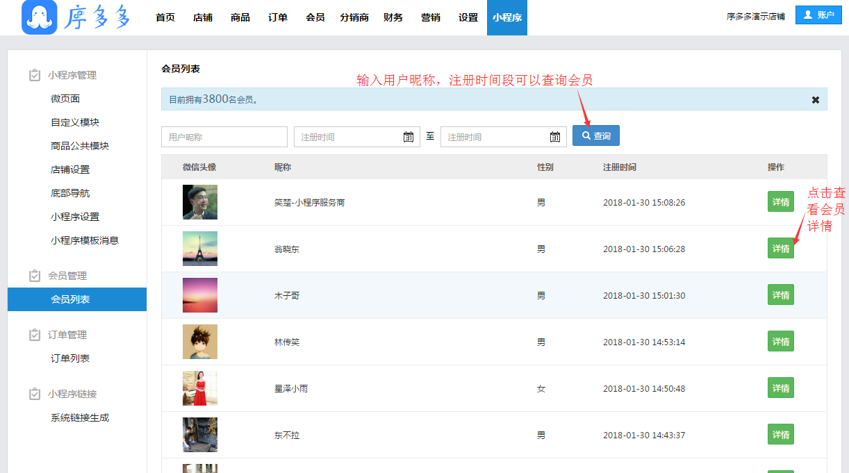 会员列表:进入过小程序的所有会员(消费者、未消费者、浏览的用户等)
