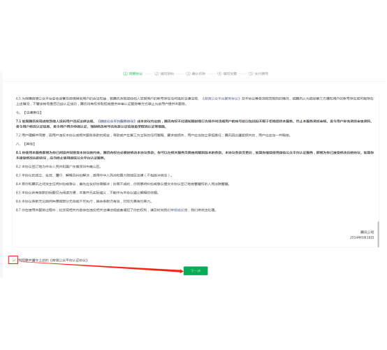 7、同意协议,点击下一步,然后跟着下面的流程填写相关资料就可以了,等待审核。