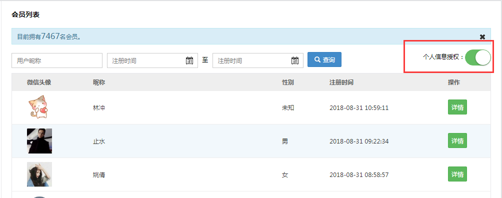 新增小程序的个人信息授权的开启/关闭按钮,如下图只有开启后才可以获取到用户的昵称和头像
